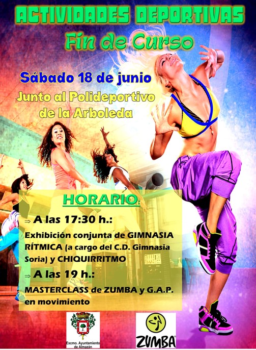 Sábado 18 de junio junto al Polideportivo de la Arboleda. A las 17:30 h: Exhibición Conjunta de Gimnasia Rítmica y Chiquirritmo. A las 19 h.: Masterclass de Zumba y GAP en Movimiento