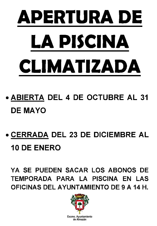 Permanecerá abierta del 4 de octubre al 31 de mayo y se cerrará del 23 de diciembre al 10 de enero. Los Abonos se pueden sacar en las oficinas del Ayuntamiento de lunes a viernes de 9 a 14 h.