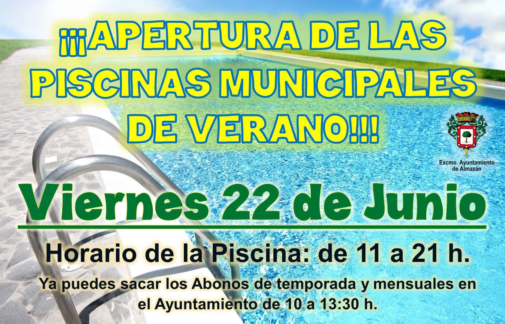 Este viernes 22 de junio se abrirán las Piscinas Municipales. Se pueden sacar los abonos de temporada y mensuales en el Ayuntamiento de lunes a viernes 10 a 13:30 h.