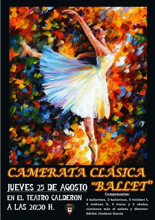 CAMERATA CLÁSICA BALLET nos ofrece una actuación innovadora, sorprendente, cercana y pedagógica con 2 bailarines, 2 bailarinas, 3 violines I, 3 violines II, 2 violas y 2 chelos, clavinova más el solista y director: Adrián Jiménez García.