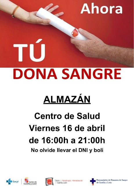 Este viernes, 16 de abril en el Centro de Salud de 16 a 21 h. Dona sangre. (No olvide llevar DNI y boli)