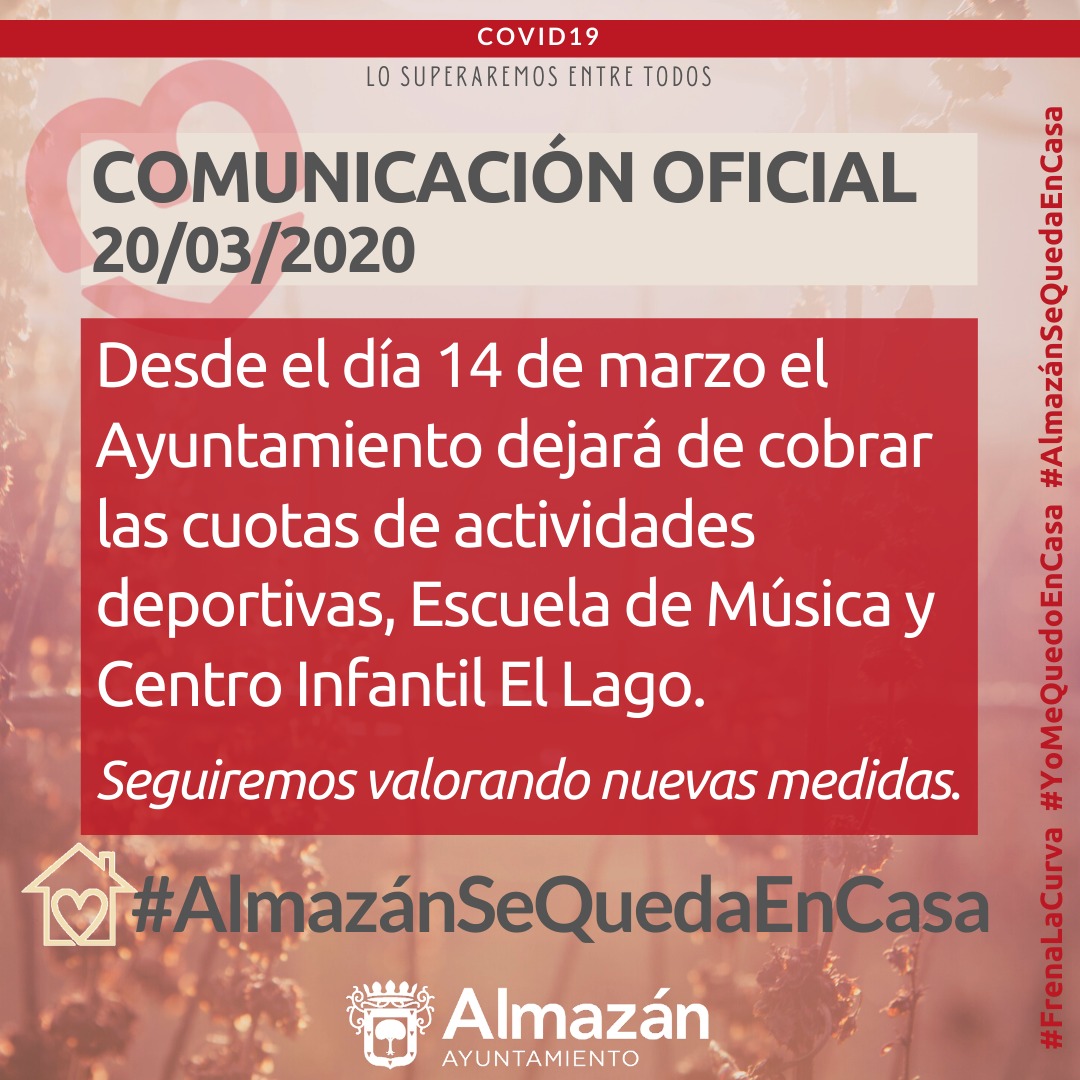 COMUNICACIÓN OFICIAL: DESDE EL 14 DE MARZO EL AYUNTAMIENTO NO COBRARÁ LAS CUOTAS DE ACTIVIDADES DEPORTIVAS, ESCUELA DE MÚSICA Y CENTRO INFANTIL.