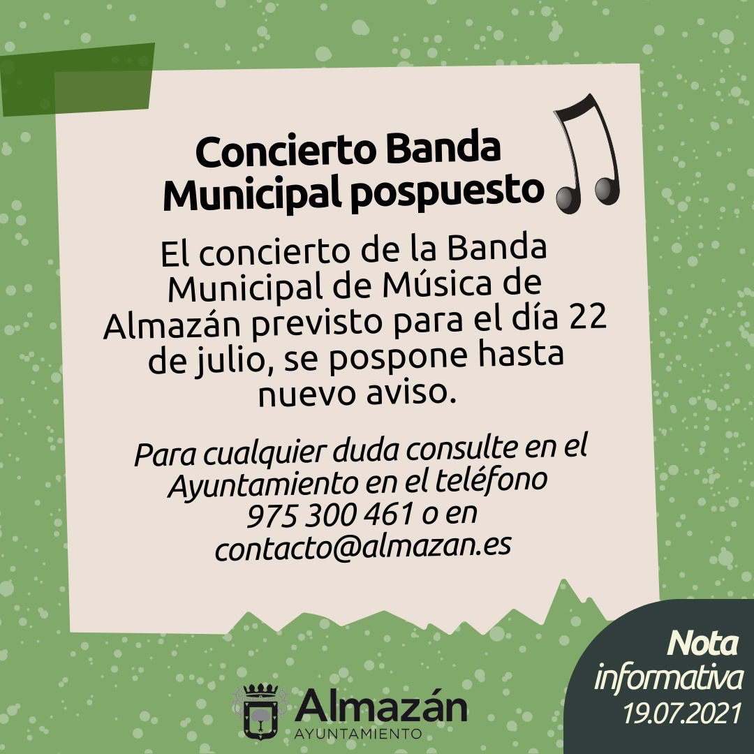 El concierto de la Banda Municipal de Música de Almazán previsto para el día 22 de julio, se pospone hasta nuevo aviso.
