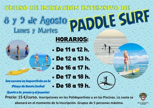 Lunes 8 y martes 9 de agosto. Grupos de 5 personas máximo. Horarios: de 11 a 12 h., de 12 a 13 h., de 16 a 17 h, de 17 a 18 h. y de 18 a 19 h. Precio curso: 15 €. Inscripciones en los Polideportivos y en las Piscinas.