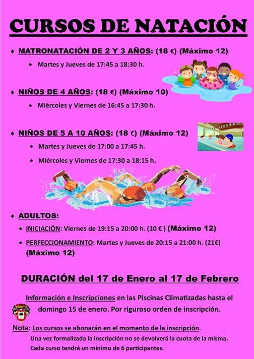 Matronatación, niñ@s de 4 a 10 años y adultos. Del 17 de enero al 17 de febrero. Inscripciones hasta el 15 de enero en la Piscina Climatizada.