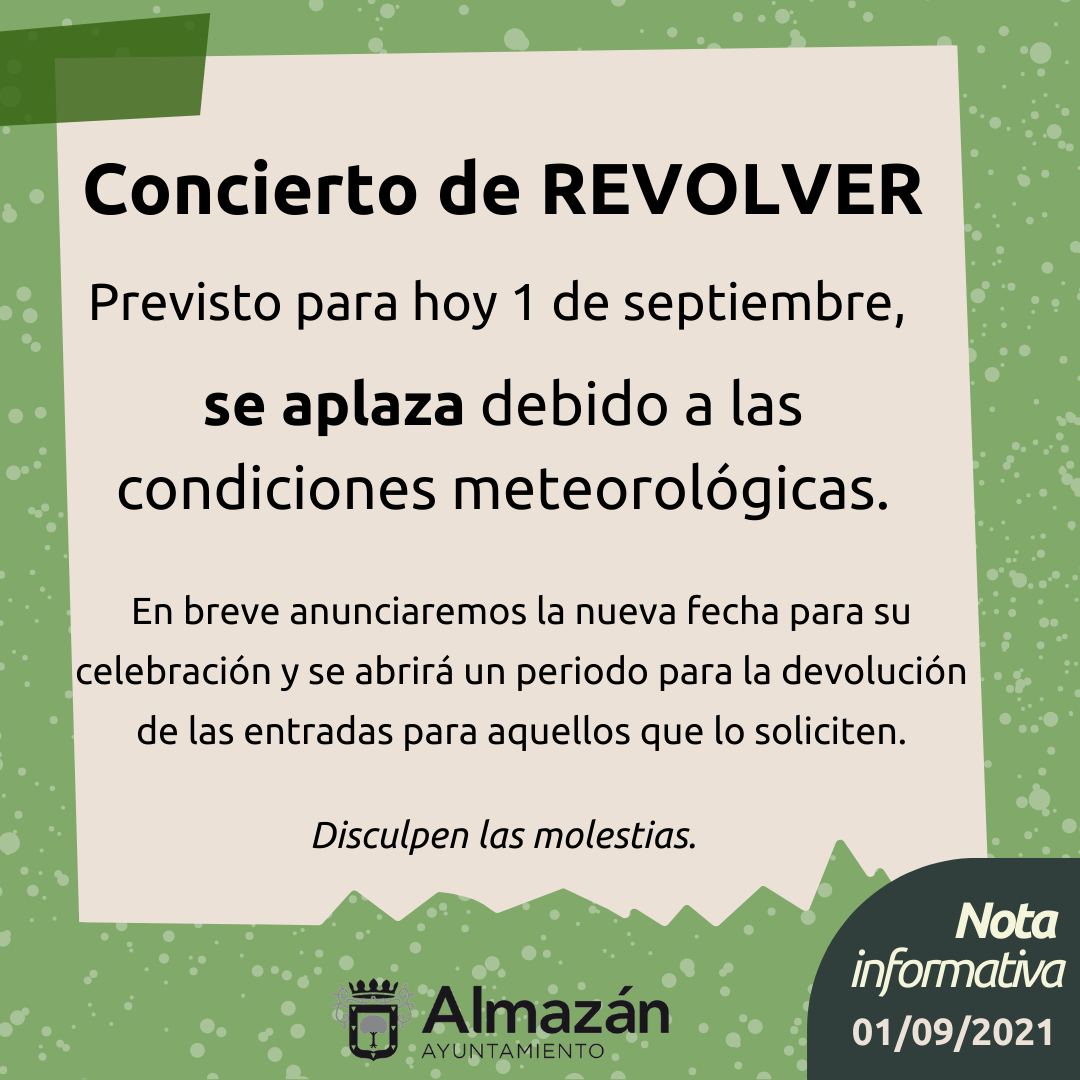 El Concierto de REVOLVER previsto para hoy 1 de septiembre se aplaza debido a las condiciones meteorológicas.