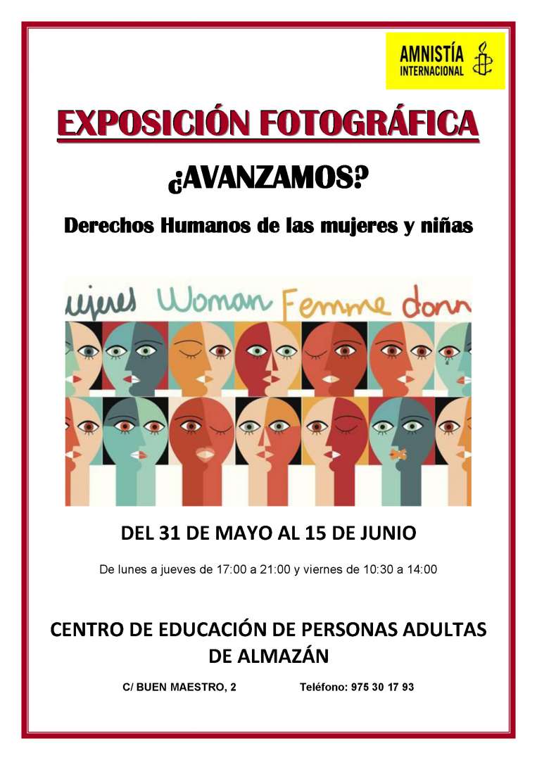 El Centro de Educación de Personas Adultas de Almazán ubicado en la Calle Buen Maestro 2, alberga desde hoy jueves 31 de mayo hasta el viernes 15 de junio la exposición fotográfica "¿Avanzamos? Derechos de mujeres y niñas" cedida por Amnistía Internacional.