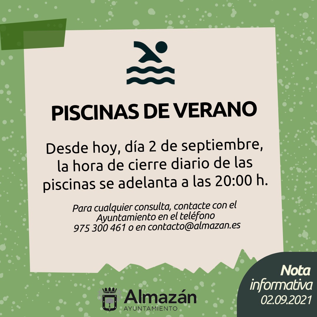 Desde hoy, día 2 de septiembre, la hora de cierre diario de las piscinas se adelanta a las 20:00 h.