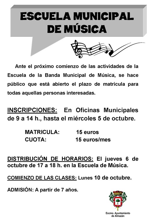 Inscripciones hasta el 5 de Octubre en las Oficinas del Ayuntamiento. Distribución de horarios el jueves 6 de octubre de 17 a 18 h. Inicio de las Clases el 10 de octubre.