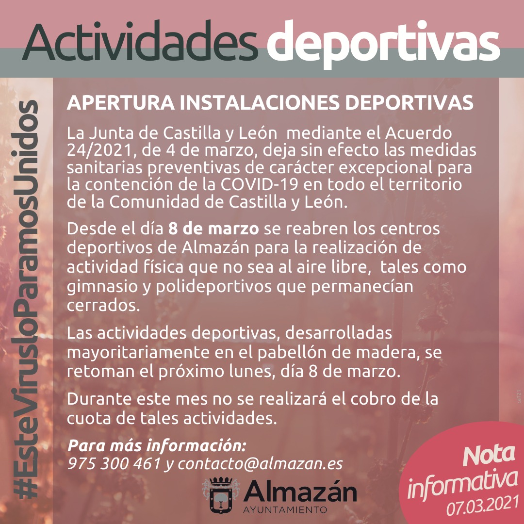 Se reabren gimnasio y polideportivos así como se retoman las actividades deportivas el lunes 8 de marzo. Durante este mes no se cobrará la cuota de estas actividades.