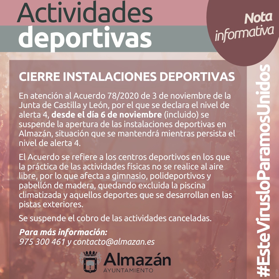 En atención al Acuerdo 78/2020 de 3 de noviembre de la Junta de Castilla y León se suspende la apertura de las instalaciones deportivas mientras dure el nivel de alerta 4.