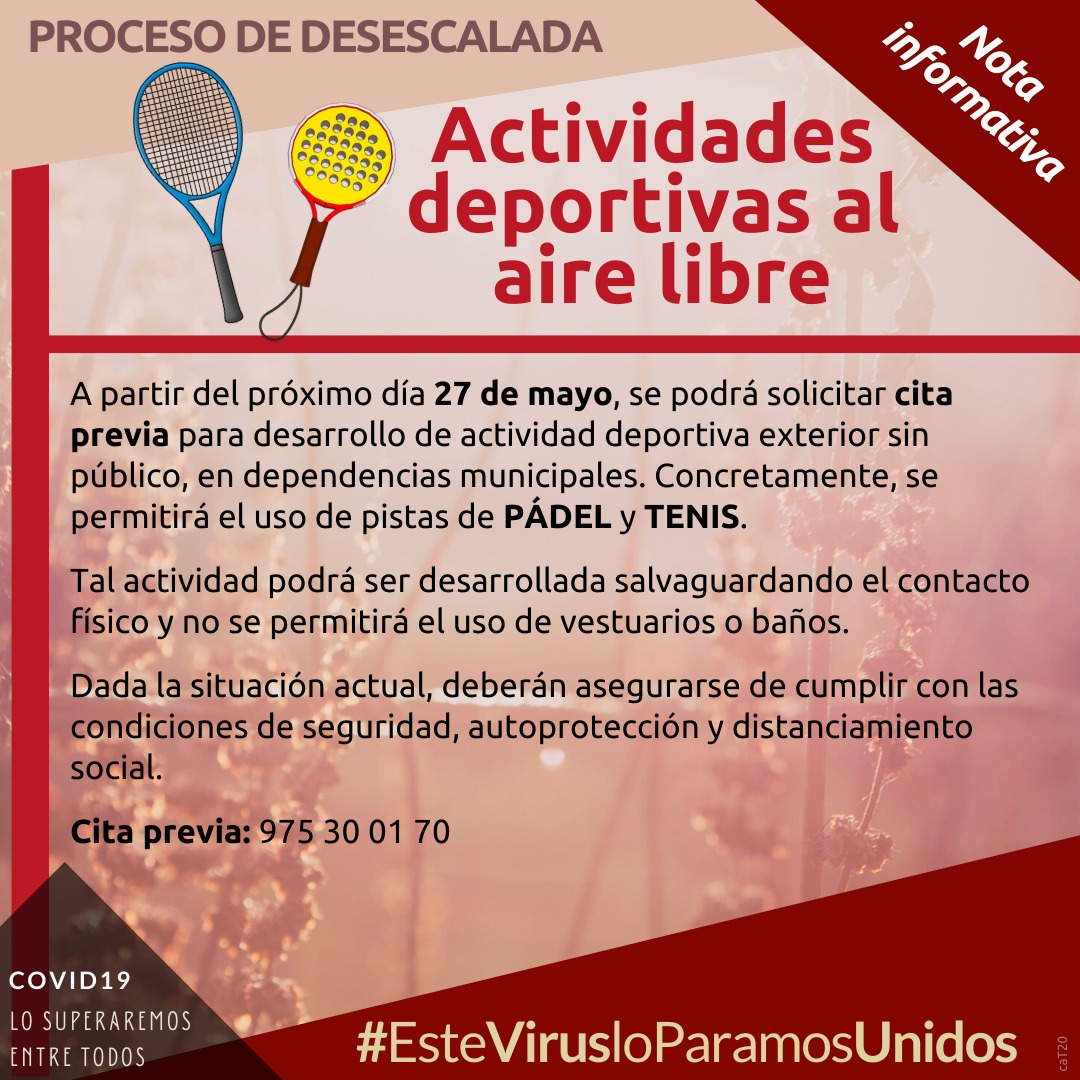 Desde el 27 de mayo se podrá solicitar cita previa para el uso de las pistas de PÁDEL y TENIS en el tfno 975 300170. Se cumplirán las condiciones de seguridad, autoprotección y distanciamiento social.