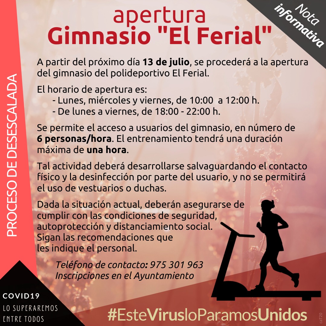 partir del 13 de julio se abrirá el Polideportivo El Ferial en horario: lunes, miercoles y viernes de 10 a 12 h. y de lunes a viernes de 18 a 22 h. Se permite el acceso al gimnasio a 6 personas/hora.