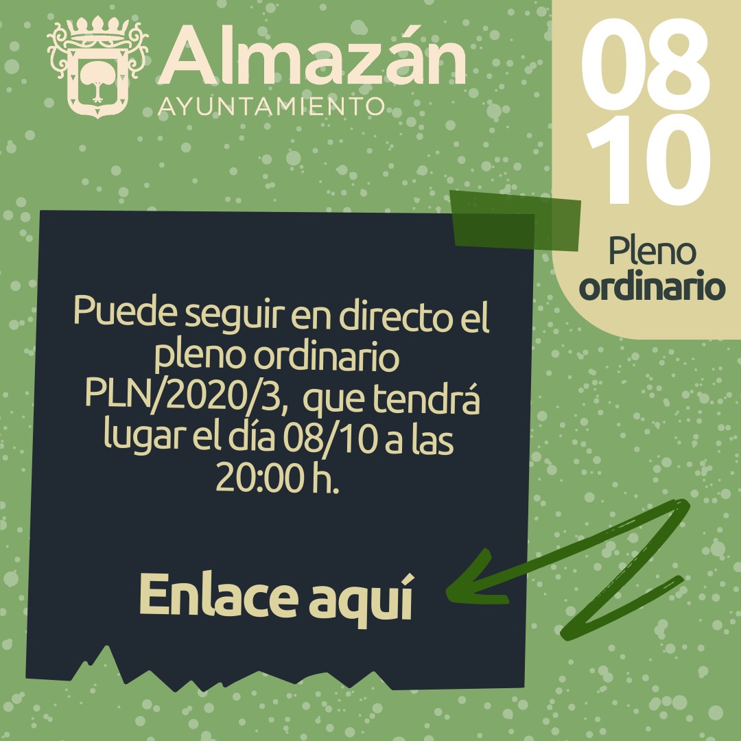 Hoy, 8 de octubre a las 20:00 h. el Ayuntamiento de Almazán celebrará el Pleno de Corporación en convocatoria ordinaria para aprobar el acta de la sesión anterior, la ordenanza reguladora de vertido de residuos de origen animal, ganadero o similar, modificar los créditos del Patronato Municipal de Nuestra Señora de Guadalupe y aprobar la cuenta general del ejercicio 2019.
