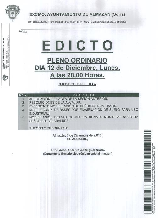 Lunes, 12 de diciembre de 2016 a las 20:00 h. en el Salón de Plenos del Ayuntamiento.