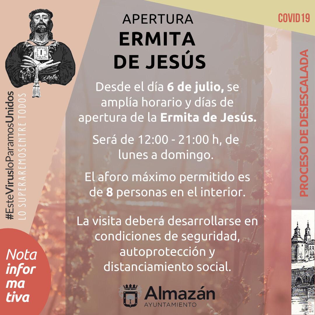 Desde el día 6 de julio se amplía el horario y días de apertura de la Ermita de Jesús: será de 12 a 21 h. de lunes a domingo. El aforo máximo permitido es de 8 personas en el interior.