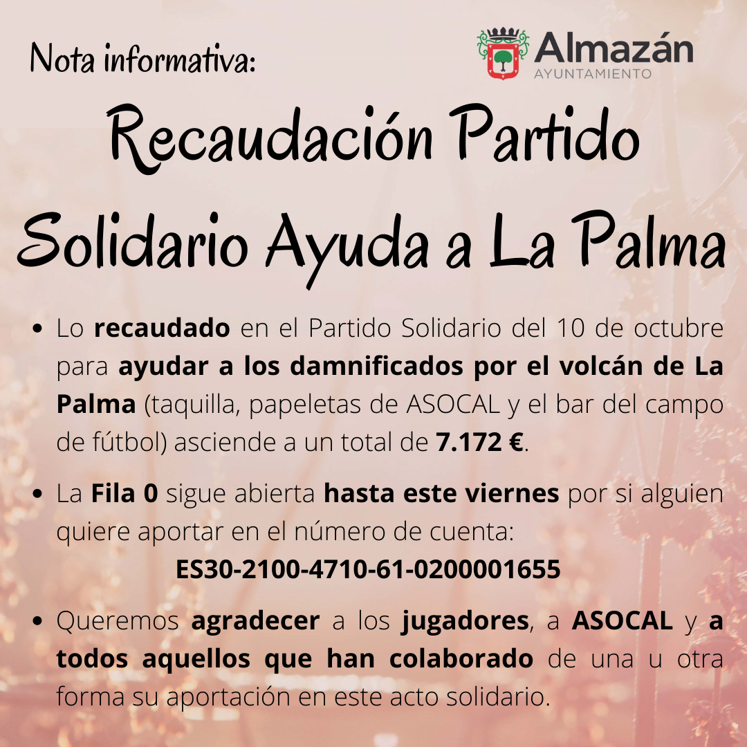 - Lo recaudado en el Partido Solidario del 10 de octubre para ayudar a los damnificados por el volcán de La Palma (taquilla, papeletas de ASOCAL y el bar del campo de fútbol) asciende a un total de 7.172 €.