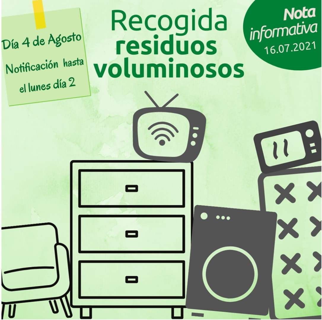 El próximo día 4 de Agosto, miércoles, se va a proceder a la recogida de residuos voluminosos (electrodomésticos, muebles, sillas, colchones, etc) por los servicios municipales para su traslado al punto limpio.