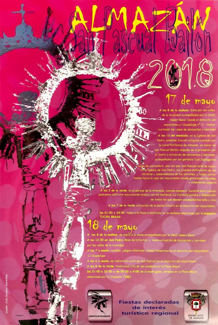 A las 12 del mediodía, en la Iglesia de San Pedro, solemne función religiosa cantada por la Coral Polifónica de Almazán, en honor de San Pascual Bailón, seguida de la procesión con el Santo y actuación de danzantes y zarrones, acompañados por los gaiteros “Los Soplagaitas".
