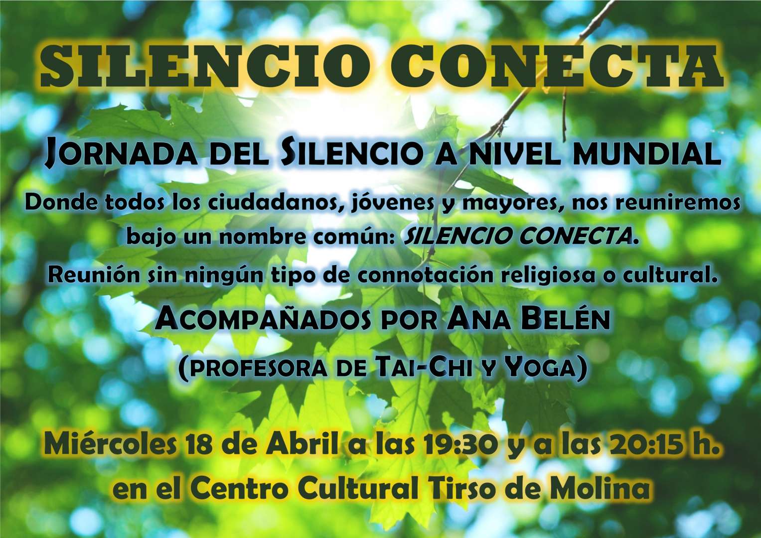 Jornada del Silencio a nivel mundial. Miércoles 18 de abril en el Centro Cultural Tirso de Molina, a las 19:30 y a las 20:15 h.