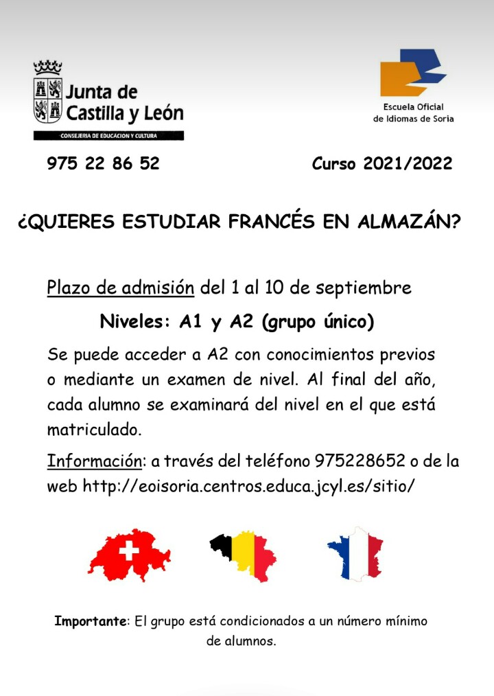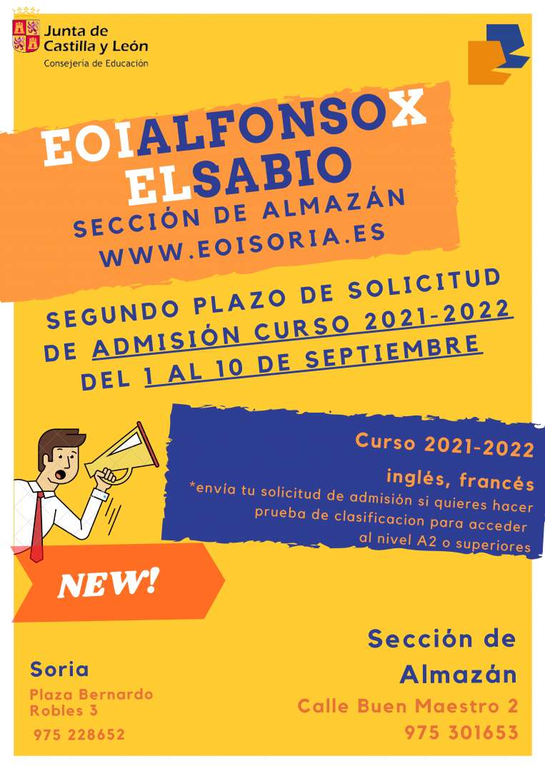 Del 1 al 10 de septiembre solicita tu plaza en la EOI-Sección de Almazán. Colaboremos para asegurar la oferta educativa de este Centro.