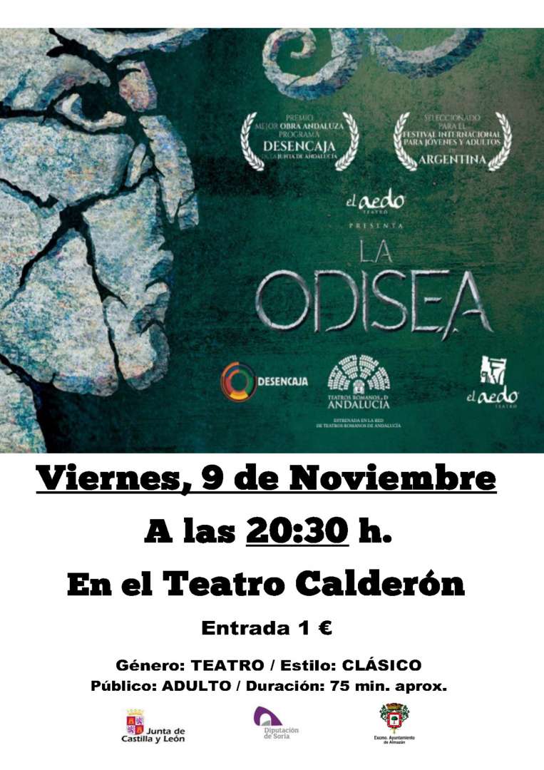 La representación de LA ODISEA será este viernes 9 de noviembre a las 20:30 h. en el Teatro Calderón, con el simbólico precio de 1€. La obra está catalogada como Teatro Clásico para Adultos y una duración aproximada de 75 minutos.
