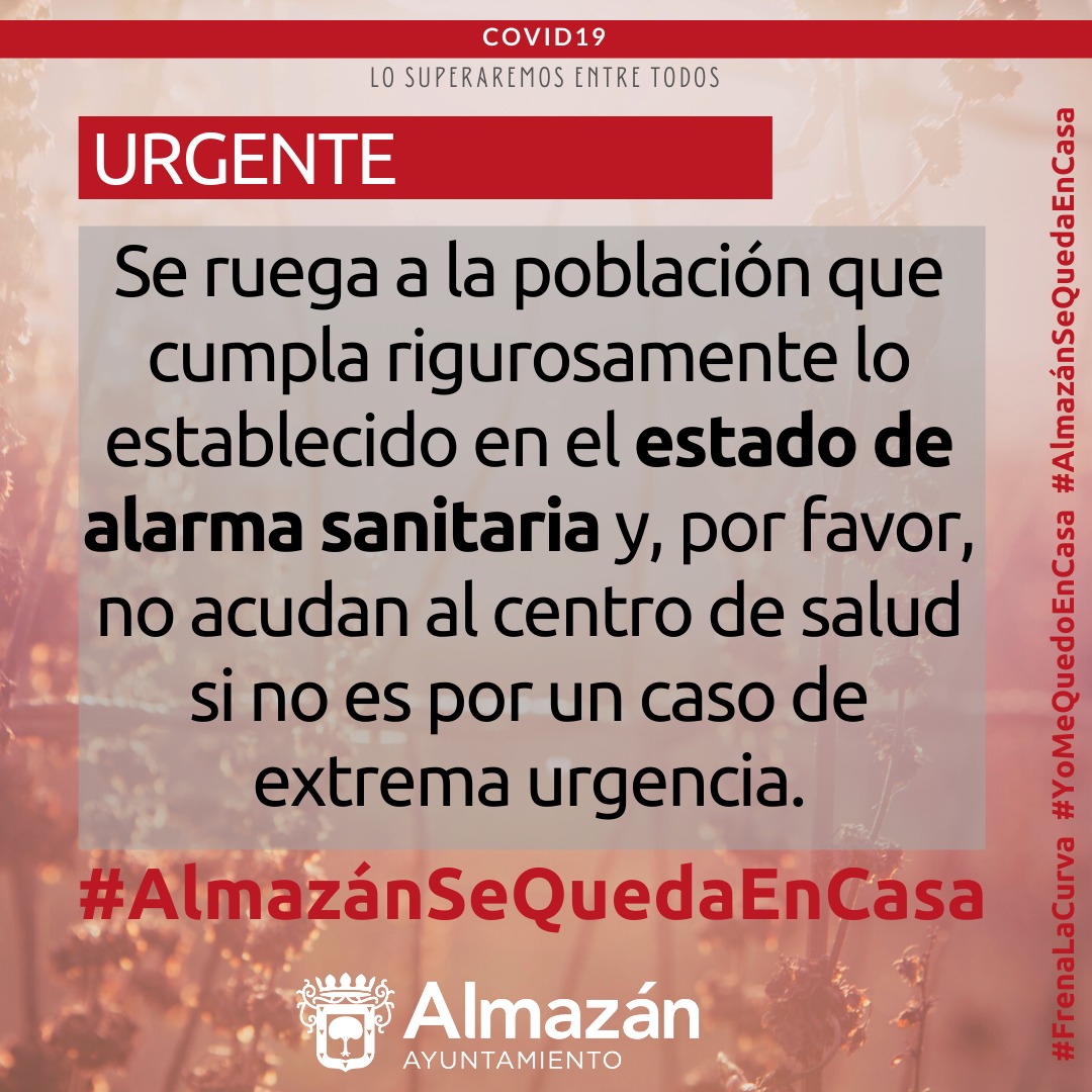 Se ruega a la población que cumpla rigurosamente el ESTADO DE ALARMA SANITARIA y no acudir al centro de salud si no es por un caso de extrema urgencia.