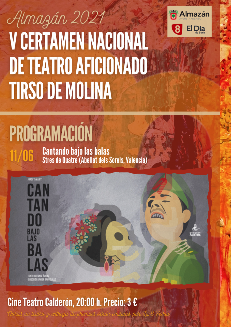 El viernes 11 de junio, a las 20:00 h. tendrá lugar en el Teatro Calderón la representación de otra de las obras finalistas de esta edición del V Certamen de Teatro Aficionado Tirso de Molina. En esta ocasión, de la mano de Stres de Quatre (Abellat dels Sorels, Valencia) con la obra Cantando bajo las balas.