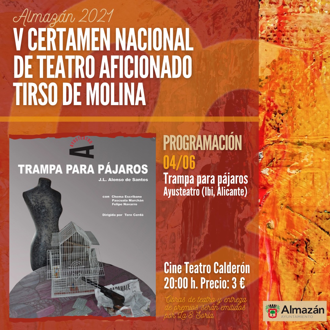 El viernes 4 de junio, a las 20:00 h. continúan en el Teatro Calderón las representaciones de las obras finalistas de esta edición del V Certamen de Teatro Aficionado Tirso de Molina, en esta ocasión de la mano de Ayusteatro (Ibi, Alicante) con la obra Trampa para pájaros.