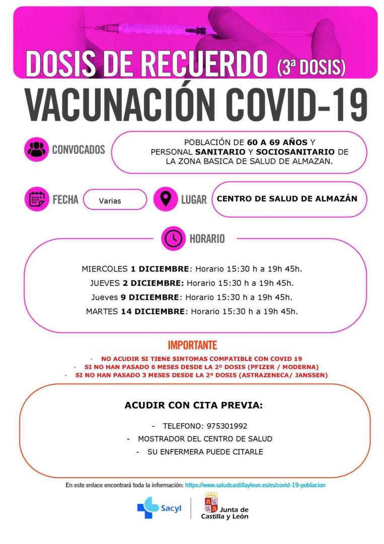 Desde el Centro de Salud de Almazán nos informan de la campaña de vacunación contra el COVID-19 con la 3ª dosis. La campaña va dirigida a la población de 60 a 69 años y personal sanitario y sociosanitario de la zona básica de salud de Almazán.