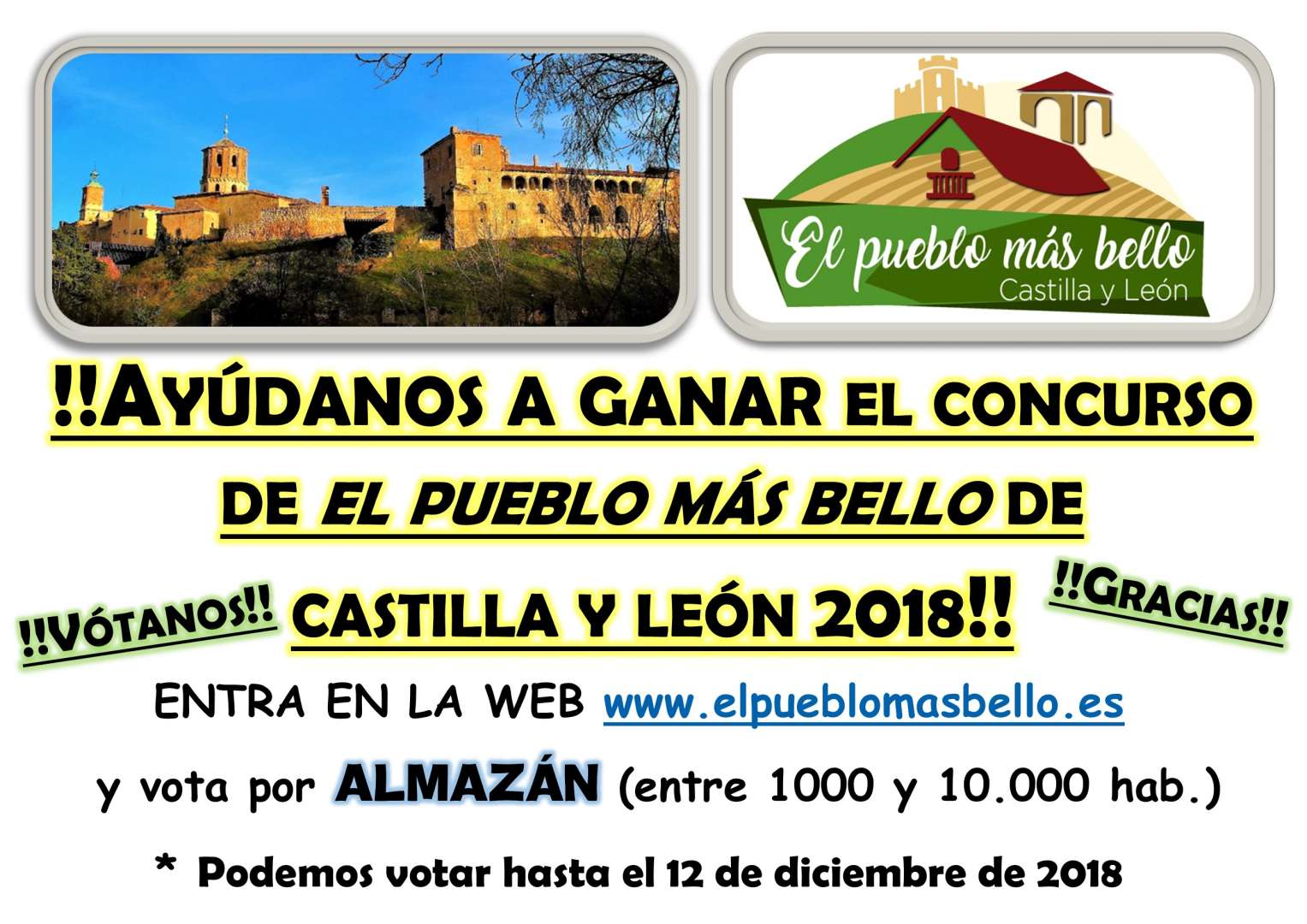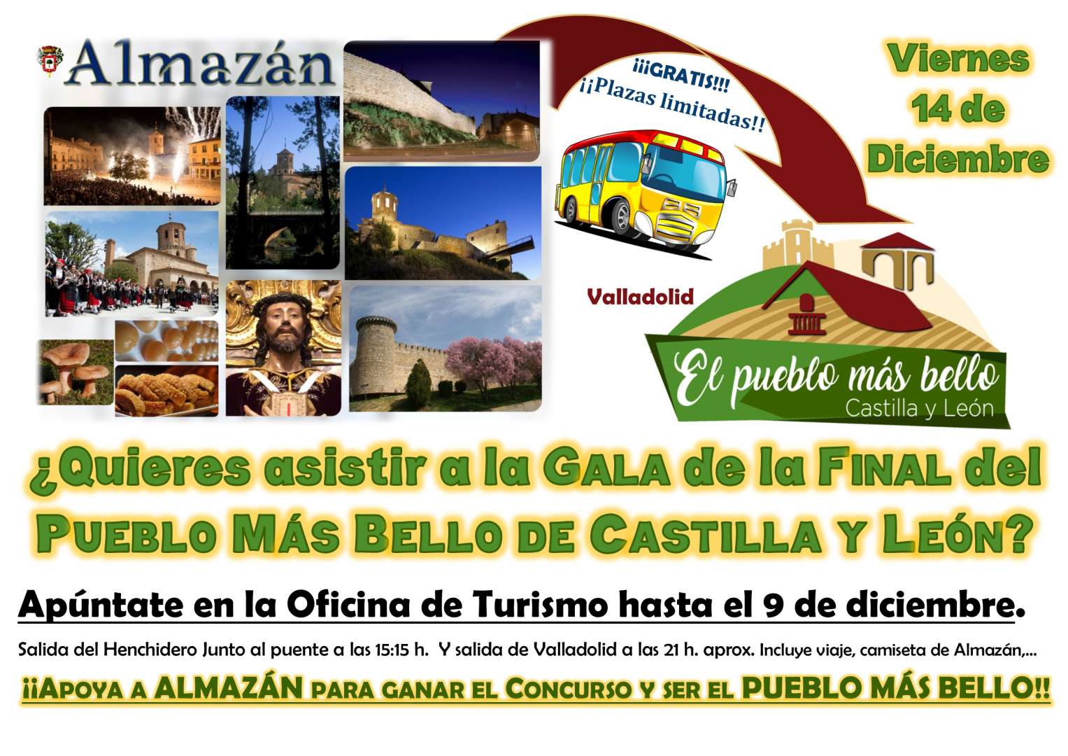 El viernes 14 de diciembre será la GALA del Concurso del PUEBLO MÁS BELLO. Si quieres asistir de forma gratuita apúntate en la Oficina de Turismo hasta el 9 de diciembre (incluye viaje, camiseta,...)