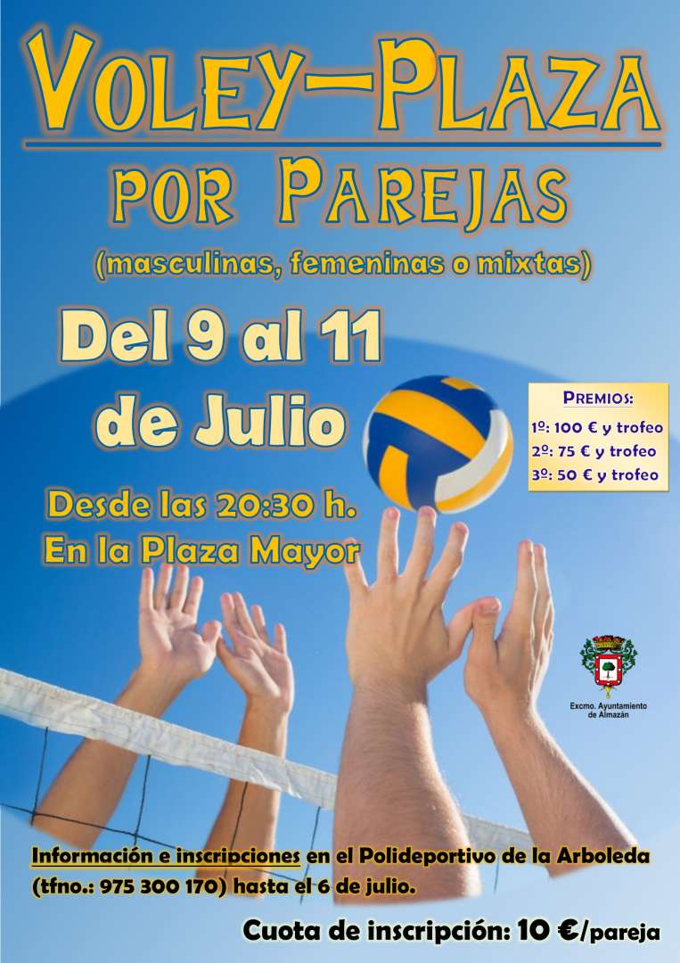 Competición de voley-plaza por parejas: masculinas, femeninas o mixtas del 9 al 11 de julio a partir de 20:30 h. Información e inscripciones en el Polideportivo de la Arboleda.