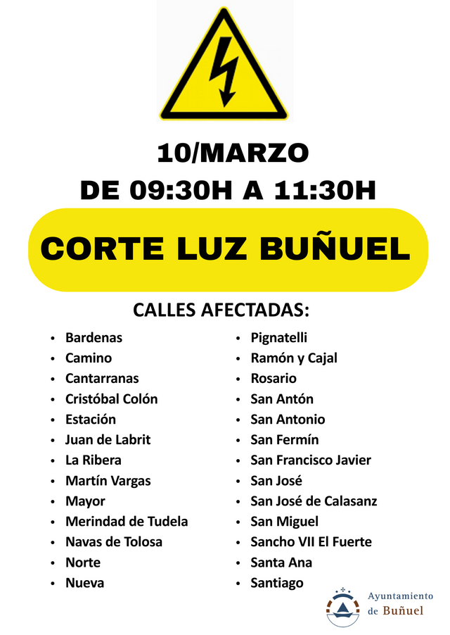 CORTE DE LUZ EN BUÑUEL - 10/MARZO - DE 09:30H A 11:30H