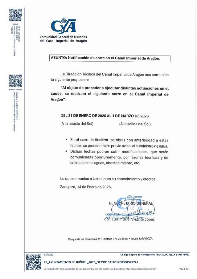 NOTIFICACIÓN CORTE CANAL IMPERIAL DE ARAGÓN