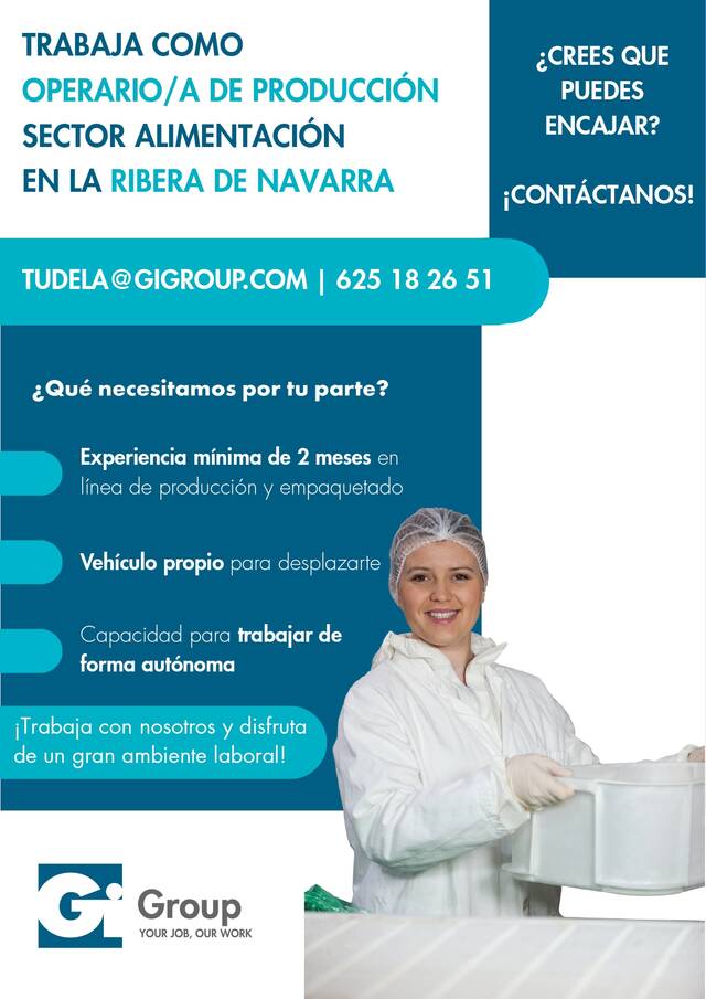 OFERTA DE EMPLEO.- OPERARI@ PRODUCCIÓN SECTOR ALIMENTACIÓN EN LA RIBERA DE NAVARRA