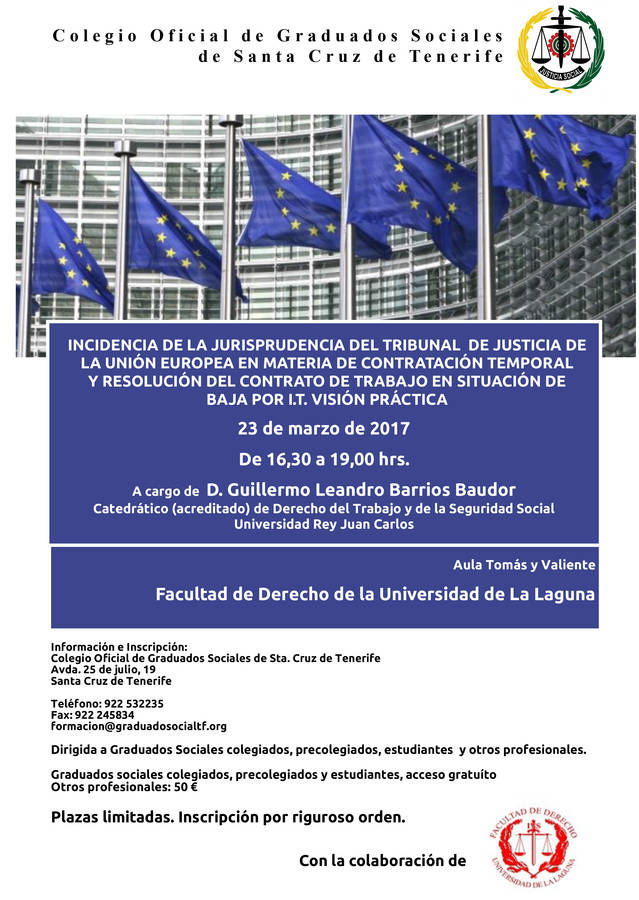 Esta Jornada está organizada por el Colegio Oficial de Graduados Sociales de Santa Cruz de Tenerife y tendrá lugar en el Aula Tomás y Valiente de la Facultad de Derecho de la Universidad de La Laguna el próximo 23 de marzo. Intervendrá como ponente Don Guillermo Leandro Barrios Baudor, Catedrático (Acreditado) de Derecho del Trabajo y de la Seguridad Social de la Universidad Rey Juan Carlos.