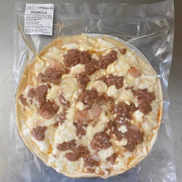 Ingredients: Farnina de blat, aigua, oli vegetal, llevat, llet, sucre, sal, farina de panis, sémola de blat, mozzarella, emmental, tomata, bacon, pernil dolç, gambes i xampinyons