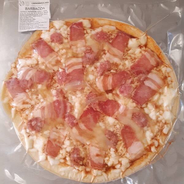 Ingredients: Farnina de blat, aigua, oli vegetal, llevat, llet, sucre, sal, farina de panis, sémola de blat, mozzarella, emmental, tomata, bacon, carn picada, ceba i salsa barbacoa