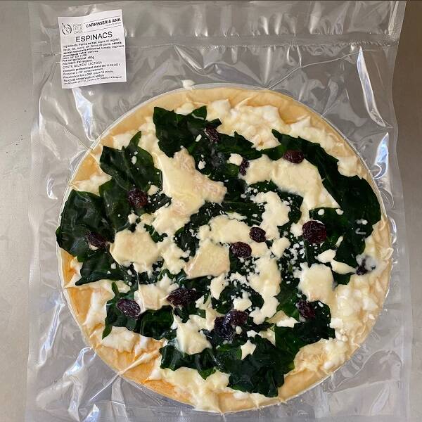 Ingredients: Farnina de blat, aigua, oli vegetal, llevat, llet, sucre, sal, farina de panis, sémola de blat, mozzarella, emmental, tomata, espinacs, formatge de cabra i pances.