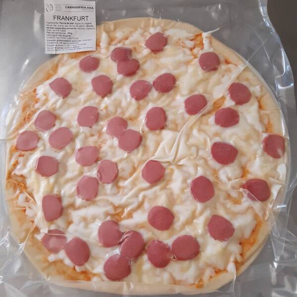 Ingredients: Farnina de blat, aigua, oli vegetal, llevat, llet, sucre, sal, farina de panis, sémola de blat, mozzarella, emmental, tomata i frankfurt