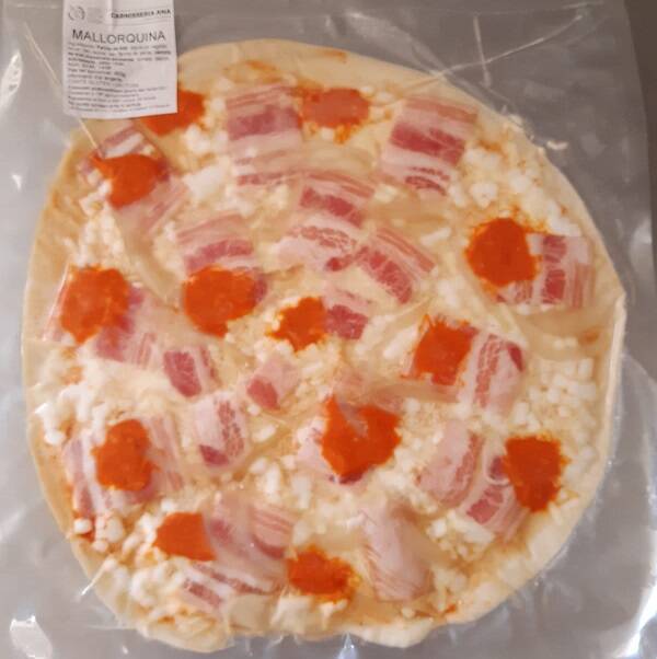 Ingredients: Farnina de blat, aigua, oli vegetal, llevat, llet, sucre, sal, farina de panis, sémola de blat, mozzarella, emmental, tomata, bacon, sobrasada, deba i mel