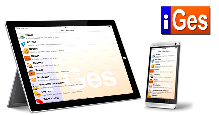 iGes es una aplicación de autoventa, preventa y facturación diseñada para PC y dispositivos móviles destinados a realizar pedidos, albaranes, facturas, introducción de visitas, itinerarios de seguimiento, cargos de gestión, gastos, etc.