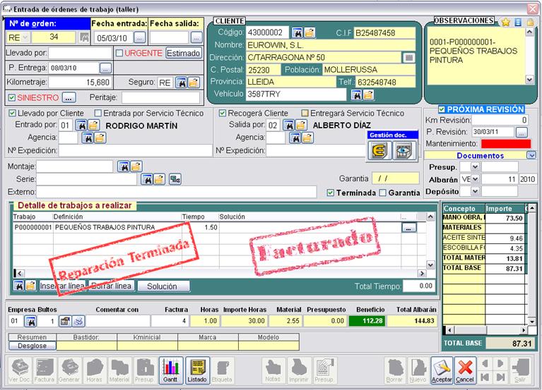 - Entrada de horas de operarios y materiales utilizados en estos servicios.